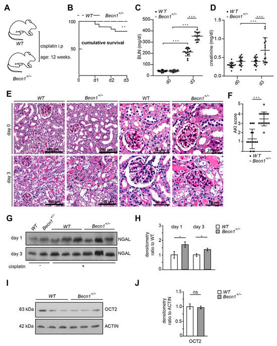 Becn1+/− sensitizes towards cisplatin nephropathy: (A) Schematic of the study protocol. (B) Cumulative survival of WT and Becn1+/− mice after cisplatin exposure (n = 15 each group, ** ≤ 0.01). (C) BUN of WT and Becn1+/− mice after cisplatin exposure (n = 15 each group, dose: 20 mg/kg, *** ≤ 0.001). (D) Serum creatinine of WT and Bec1+/− mice after cisplatin exposure (n = 15, *** ≤ 0.001). (E) Representative kidney sections stained with hematoxylin–eosin solution obtained from WT and Becn1+/− mice after cisplatin exposure at the time point as indicated. (F) AKI score obtained from WT and Becn1+/− mice after cisplatin exposure (n = 15, *** ≤ 0.001). (G) Western blot showing the abundance of urinary NGAL from WT and Becn1+/− mice after cisplatin exposure. (H) Densitometry for the abundance of urinary NGAL from WT and Becn1+/− mice after cisplatin exposure (n = 3; * ≤ 0.05). (I) Western blot showing the abundance of OCT2 in kidney lysates obtained from WT and Becn1+/− mice. (J) Densitometry for the abundance of OCT2 in kidney lysates obtained from WT and Becn1+/− mice (n = 3, ns = non significant).