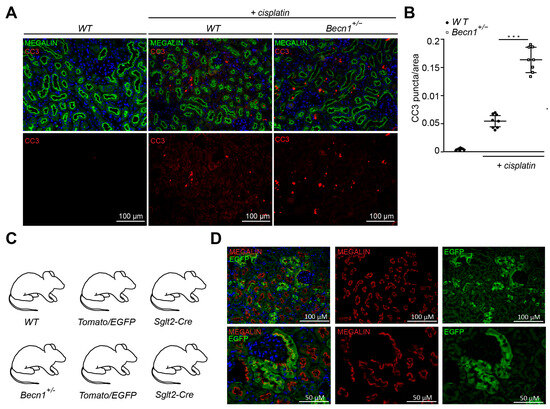 Becn1+/− sensitizes mice towards tubular cell apoptosis cisplatin nephropathy: (A) Representative immunofluorescence staining of kidney section obtained from WT and Becn1+/− mice with and without cisplatin exposure for MEGALIN and cleaved CASPASE3. (B) Quantification of cleaved CASPASE3 signal in kidney section obtained from WT and Becn1+/− mice with and without cisplatin exposure (n = 8, *** ≤ 0.001). (C) WT and Becn1+/− mice were crossed to Sglt2-Cre and Tomato/EGFP mice to obtain green fluorescent proximal tubular cells. (D) Representative immunofluorescence staining of kidney section obtained from Becn1+/−;Tomato/EGFP;Sglt2-Cre mice and corresponding WT controls for MEGALIN and endogenous EGFP. (E) Schematic for the generation of primary proximal tubular cells from Becn1+/−;Tomato/EGFP;Sglt2-Cre mice and corresponding WT controls. (F) Flow cytometric analysis result of annexin and propidium iodide staining for the assessment of apoptosis in primary proximal tubular cells obtained from Becn1+/−;Tomato/EGFP;Sglt2-Cre mice and corresponding WT controls with and without cisplatin exposure.
