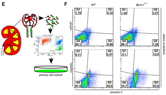 To gain further insights into the mechanism of renal deterioration in cisplatin-exposed Becn1+/− mice, apoptotic markers were assessed. Immunostaining for cleaved CASPASE3 revealed a high activity of the apoptotic pathway in Becn1+/− mice after cisplatin exposure (Figure 2A,B). For further analysis, we crossed Becn1+/− mice with Tomato/EGFP reporter mice and Sglt2-Cre mice (Figure 2C). We thereby generated mice with green fluorescent proximal tubular cells (Figure 2D). This genetic cell-specific labeling allowed for primary tubular cell culture after kidney dissection, digestion and sieving with subsequent fluorescence-activated cell sorting (FACS) (Figure 2E). We thereby generated WT and Becn1+/− primary proximal tubular cells and exposed these cells to cisplatin. FACS-based analysis of apoptosis was performed by using annexin V and propidium iodide (PI) staining. According to our in vivo data, ex vivo-exposed primary proximal tubular cells also showed a significant increase in apoptosis after cisplatin exposure if the amount of BECLIN1 was reduced (Figure 2F).
