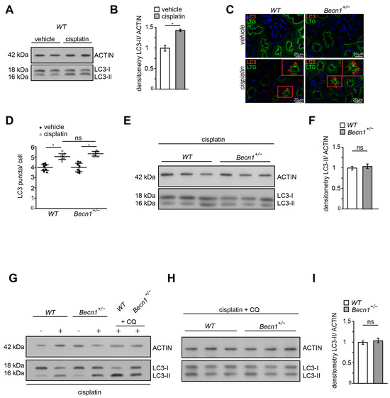 Cisplatin induces autophagy independent from BECLIN1 abundance in vivo: (A) Western blot for the abundance of LC3 and β-ACTIN in lysates obtained from kidney of vehicle- or cisplatin-exposed mice (after 3 days, dose: 20 mg/kg). (B) Densitometry for the abundance of LC3-II in lysates obtained from kidney of vehicle- or cisplatin-exposed mice (n = 3, * ≤ 0.05). (C) Immunofluorescence staining for LTG and LC3 in kidney section obtained from WT and Becn1+/− mice with and without cisplatin exposure. (D) Quantification of LC3 signal in kidney section obtained from WT and Becn1+/− mice with and without cisplatin exposure (n = 8, * ≤ 0.05, ns = non significant). (E) Western blot for the abundance of LC3 and β-ACTIN in lysates obtained from kidneys of vehicle- or cisplatin-exposed WT and Becn1+/− mice (short exposure for LC3). (F) Densitometry for the abundance of LC3-II in lysates obtained from kidneys of cisplatin-exposed WT and Becn1+/− mice (n = 3, ns = non significant). (G) Western blot for the abundance of LC3 and ß-ACTIN in lysates obtained from primary proximal tubular Becn1+/− and WT cells after exposure to cisplatin (200 µmol/L, 12 h) with and without chloroquine (100 µmol/L, 12 h). (H) Western blot for the abundance of LC3 and β-ACTIN in lysates obtained from primary proximal tubular Becn1+/− and WT cells after exposure to cisplatin (200 µmol/L, 12 h) with chloroquine (100 µmol/L, 12 h). (I) Densitometry for the abundance of LC3-II in lysates obtained from primary proximal tubular Becn1+/− and WT cells after exposure to cisplatin (n = 3, ns = non significant).