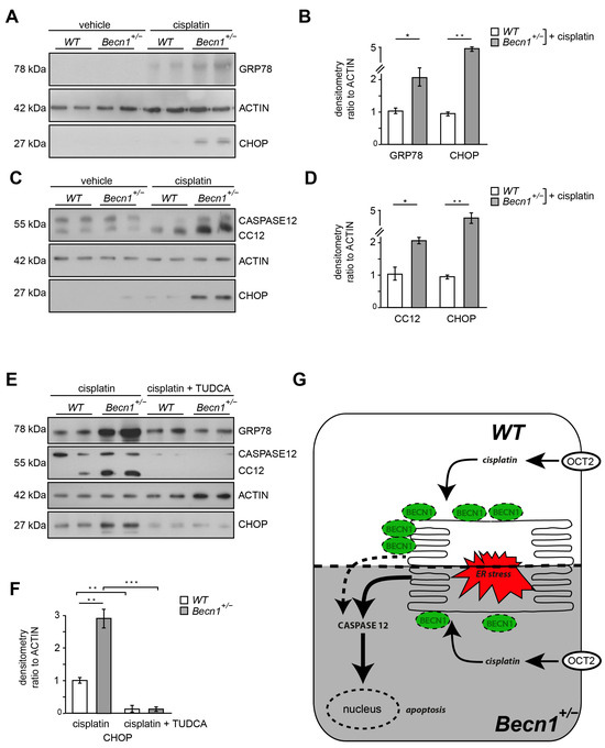 In WT mice, BECLIN1 levels increased after cisplatin exposure (Figure S3A). In Becn1+/− mice, however, this upregulation after cisplatin exposure was blunted (Figure S3B). These data suggest a role of BECLIN1 in cellular stress response. Since cisplatin increases ER stress and BECLIN1 has been shown to localize to ER, we assessed markers of ER stress in kidney lysates of Becn1+/− and WT mice after cisplatin exposure [27,28]. ER stress markers GRP78 and CHOP massively increased in Becn1+/− mice compared to WT (Figure 4A,B). In vitro, primary proximal tubular cells obtained from WT mice showed a moderate increase in ER stress after cisplatin exposure, whereas in Becn1+/− primary proximal tubular cells ER stress was massively increased (Figure 4C–E). Accordingly, CASPASE12 cleavage was strongly increased in Becn1+/− proximal tubular cells, indicating high activity of the intrinsic apoptotic pathway. To further clarify the contribution of ER stress as the key mechanism in the observed phenotype in heterozygous disruption of Beclin1, pharmacological inhibition of ER stress was performed by using tauroursodeoxycholic acid (TUDCA). Concomitant treatment with the ER stress inhibitor TUDCA significantly reduced ER stress in Becn1+/− proximal tubular cells as indicated by reduced GRP78 and CHOP abundance (Figure 4E,F and Figure S3C). Furthermore, cleavage of CASPASE12 was blunted, indicating less activation of the apoptotic pathway if ER stress was reduced. In summary, intracellular BECLIN1 content critically impacts cisplatin toxicity in proximal tubular cells by affecting ER susceptibility in an abundance-dependent manner (Figure 4G).