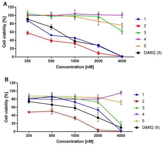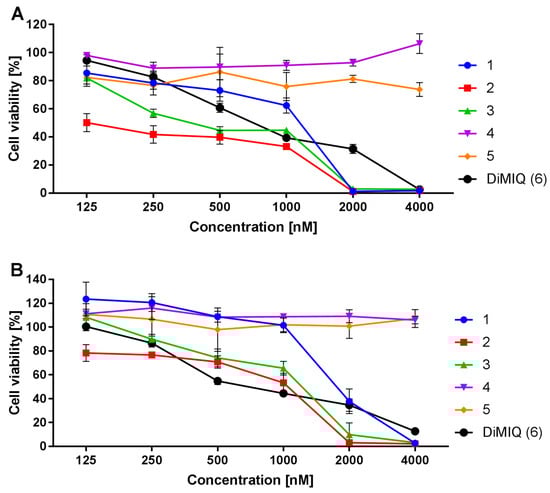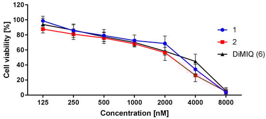 | Cell Line | SI | IC50 Compound 1 | IC50 Compound 2 | IC50 DiMIQ (6) |