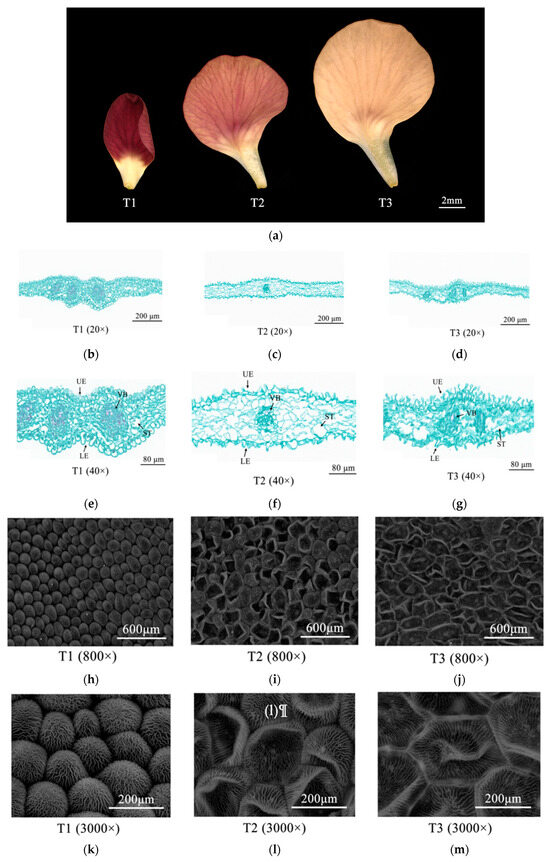 Morphological changes of Zhehuhong petal cells 2 d before flowering (T1), at flowering (T2), and 2 d after flowering: (a) under stereomicroscopy; (b–d) by paraffin section at 20×, from T1 to T3; (e–g) by paraffin section at 40×, from T1 to T3; (h–j) by scanning electron microscope at 800×, from T1 to T3; (k–m) by scanning electronic microscopy at 3000×, from T1 to T3. LE, lower epidermal cell; ST, sponge tissue; UE, upper epidermal cell; VB, vascular bundle.
