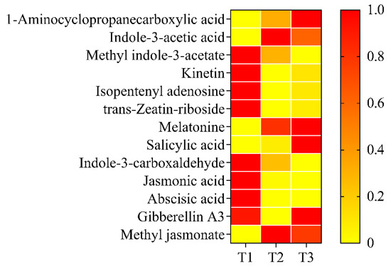 Heatmap of content of 13 phytohormones from T1 to T3. Detected phytohormones included abscisic acid, 1-aminocyclopropanecarboxylic acid, gibberellin A3, indole-3-acetic acid, indole-3-carboxaldehyde, isopentenyl adenosine, jasmonic acid, kinetin, melatonin, methyl indole-3-acetic, methyl jasmonate, salicylic acid, and trans-zeatin-riboside. T1, T2, and T3: 2 d before flowering, flowering, and 2 d after flowering. Darker red indicates higher content while darker yellow indicates lower content.