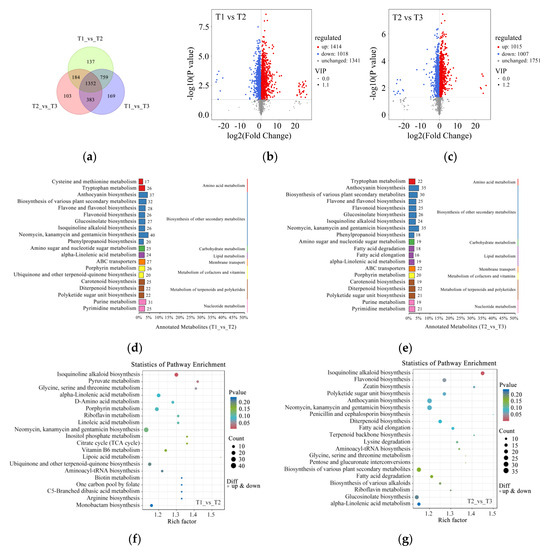 After further classification of these metabolites, it was found that the amounts of secondary metabolites were the highest, mainly related to anthocyanin, flavone and flavonol, flavonoid, isoquinoline alkaloid, and phenylpropanoid biosynthesis for T1 compared to T2 and T2 compared to T3 (Figure 4d,e). The results of pathway enrichment analysis show that the most abundant pathway was isoquinoline alkaloid biosynthesis at T1 compared to T2 (Figure 4f). However, isoquinoline alkaloid, flavonoid, and anthocyanin biosynthesis were found to be relatively abundant among the detected pathways (Figure 4g).