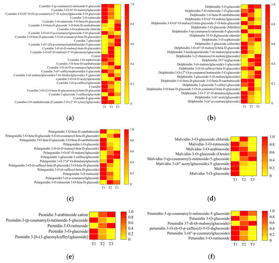 Heatmaps of content of six anthocyanins ((a) cyanindin, (b) delphinidin, (c) pelargonidin, (d) malvidin, (e) peonidin, and (f) petunidin) and their derivatives from T1 to T3. T1, T2, and T3: 2 d before flowering, flowering, and 2 d after flowering. aDarker red indicates higher content; darker yellow indicates lower content.