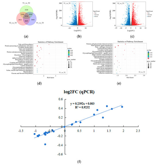 Transcriptomics analysis of petal color fading from T1 to T3: (a) Venn diagram of genes detected at T1, T2, and T3. (b,c) Volcano plots indicating gene numbers at T1 vs. T2 and T2 vs. T3. Red dots indicate upregulated genes, blue dots indicate downregulated genes, and gray dots indicate unchanged genes. (d,e) Rich factor analysis of significantly differentially expressed genes at T1 vs. T2 and T2 vs. T3. Dots indicate significantly differentially expressed metabolites, size of dots indicates metabolite counts, and color of dots indicates p-value. (f) Correlation analysis of selected genes between results of quantitative polymerase chain reaction (qPCR) and transcriptomics analysis. T1, T2, and T3: 2 d before flowering, flowering, and 2 d after flowering.