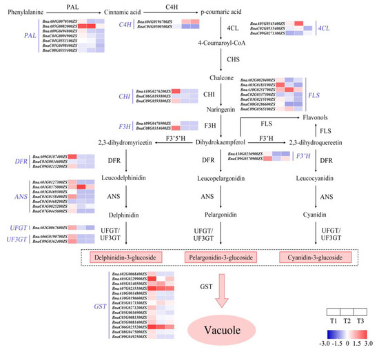 Outline of gene expression analysis of anthocyanin biosynthesis during petal color fading from T1 to T3. T1, T2, and T3: 2 d before flowering, flowering, and 2 d after flowering. Darker red indicates higher content; darker blue indicates lower content. ANS, anthocyanin synthase; C4H, cinnamate 4 hydroxylase; CHI, chalcone isomerase; CHS, chalcone synthase; 4CL, 4-coumaryl:CoA ligase; DFR, dihydroflavonol 4-reductase; F3H, flavanone 3-hydroxylase; F3′H, flavanone-3′-hydroxylase; F3′5′H, flavanone 3′5′-hydroxylase; FLS, flavonol synthase; GST, glutathione S-transferase; PAL, phenylalanine ammonia lyase; UFGT, flavonoid3-O-glucosyltransferase.