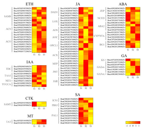 Almost 50% of identified genes encoding the enzymes S-adenosylmethionine synthetase (SAMS) and 1-aminocyclopropanecarboxylic acid oxidase (ACO) for ethylene biosynthesis were upregulated from T1/T2 to T3. However, two genes encoding 1-aminocyclopropanecarboxylic acid synthase (ACS) were upregulated from T1 to T3 (Figure 8). For IAA, only one gene, BnaC05G0025300ZS, showed increasing expression from T1 to T3. For JA, 13 genes were upregulated while 20 genes were downregulated from T1 to T3. For ABA, 10 out of 17 genes were downregulated from T1 to T3. For GA, four genes were downregulated while three genes were upregulated from T1 to T3. For CTK, two genes, BnaA09G0543500ZS and BnaC08G0389900ZS, were downregulated from T1 to T3. However, for MT, the reverse trend was found. For SA, all genes encoding two enzymes, ICS1 and PAL1, representing two main SA biosynthesis pathways, were downregulated. However, genes encoding another enzyme, PBS3, were upregulated from T1 to T3 (Figure 8).