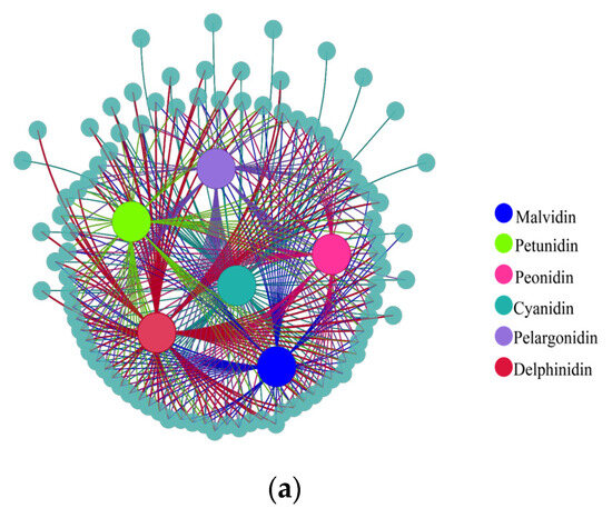 To further understand the relationship between differentially expressed metabolites and genes during fading, co-expression analysis was performed based on a correlation coefficient of more than 0.9 and p < 0.05. The results show that there were 244 pairs between cyanidin and its derivatives and corresponding genes. For delphinidin, malvidin, pelagonidin, peonidin, and petunidin and their derivatives, 313, 192, 234, 141, and 92 corresponding genes were identified, respectively (Figure 9a).