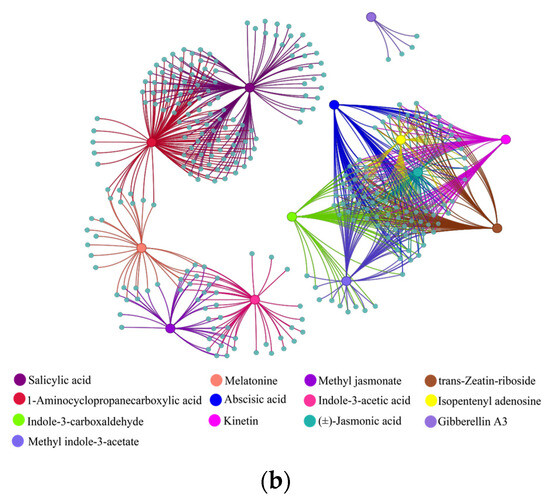 Correlation analysis of (a) metabolites and their corresponding genes and (b) phytohormones and their corresponding genes. Large solid colored circles indicate different metabolites or phytohormones, small solid gray-blue circles indicate their corresponding genes. Lines between large and small solid circles indicate positive correlations. Data were selected based on p < 0.05 and correlation coefficient more than 0.9.