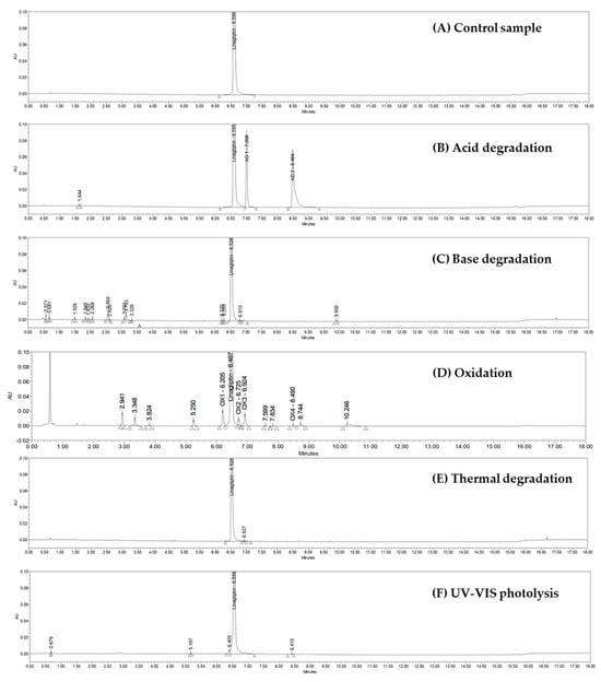 Forced degradation study chromatograms: (A) control sample (pure linagliptin); (B) exposed to acid degradation; (C) exposed to base degradation; (D) exposed to oxidation (H2O2); (E) exposed to thermal degradation, and (F) exposed to UV-VIS photolysis.