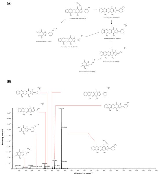 Electrospray positive ionization—mass spectrometry (ESI-MS) spectrum of linagliptin recorded using the XEVO G2-XS Q-ToF high resolution mass spectrometer (B) and proposed fragmentation pattern of Linagliptin (A).