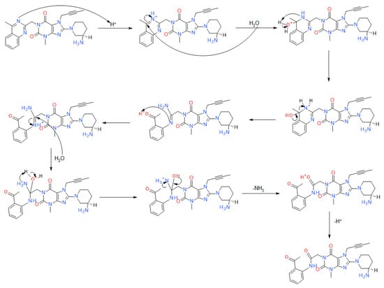 The results of this study underscore the significance of monitoring the stability of pharmaceutical compounds to ensure their safety and efficacy. Linagliptin is a highly chemically active compound with a complex molecular structure. This chemical reactivity is a consequence of its unique structure, which includes various functional groups and bonds that can readily interact with other substances. The chemical activity of linagliptin underpins its utility in pharmaceutical applications, allowing for the synthesis of derivatives, the formation of complexes, and engagement in intricate biochemical processes. This characteristic also underscores the need for careful handling and storage to prevent undesired chemical transformations that could affect its stability and efficacy. The understanding of linagliptin chemical reactivity is crucial for optimizing its formulation, ensuring its therapeutic effectiveness, and minimizing the potential for unintended reactions. This aligns with the existing literature, highlighting the importance of degradation studies in identifying potential impurities that could impact drug quality and patient health. The forced degradation study showcases the compound’s sensitivity to acid and peroxide stress conditions. This observation resonates with earlier research conducted by Attimarad et al. [], that emphasized the susceptibility of linagliptin tablets to forced degradation. The emergence of degradants emphasizes the necessity of monitoring even minor impurities that could potentially impact product quality. The identification of specific impurities provides valuable insights into the acid and oxidation degradation mechanisms. Concerning the obtained MS data, and drawing upon the available literature, we endeavor to elucidate plausible mechanisms underlying the formation of acid-induced and oxidative degradation products of linagliptin. The proposed degradation products were authenticated through commercially available standards and by synthesizing and comparing individual compounds with high-resolution MS spectra. In the ‘Supplementary Material’ section (Figures S1–S5), the MS spectra and fragmentation pathways for all analyzed impurities are provided.