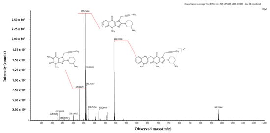 With regard to acidic degradation, we propose the following mechanistic pathways. The AD1 impurity arises from the partial hydrolysis of the quinazoline ring (Figure 3). Hydrolysis under acidic conditions is a characteristic feature of this heterocyclic system. To confirm the suggested molecular structures from the proposed reaction mechanism, measurements were carried out using a high-resolution mass spectrometer. Figure 4 illustrates the acquired mass spectra, accompanied by the structural representations of the identified compounds, which are the predominant fragmentation products detected at mass-to-charge ratios of 492.31698 m/z, 357.23484 m/z, and 329.22229 m/z. Importantly, the impurities were denoted as AD1, which we verified in our investigation. This finding is consistent with previous studies conducted by Yadav et al. [] and Huang et al. [], who reported similar impurities under comparable conditions. The retention time consistency observed in chromatograms further supports the reliability of our identification.