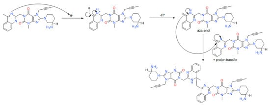 The AD2 impurity is linagliptin, which has dimerized through acid-catalyzed aza-enolization (Figure 5). The resulting Schiff base subsequently initiates a nucleophilic attack on the quinoline ring of another linagliptin molecule acting as an electrophile.