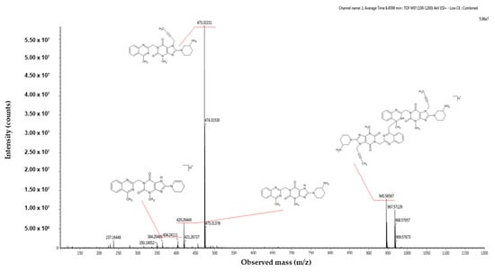 To validate its structure, we synthesized the impurity and subjected it to comprehensive characterization using MS and NMR techniques. Structural confirmation not only affirmed our identification, but also provided valuable insights into the potential mechanisms underlying its formation. As presented in Figure 6, the obtained mass spectra are presented alongside the structural depictions of the identified compounds. These compounds represent the fragmentation products detected at specific mass-to-charge ratios: 945.58567 m/z, 473.32231 m/z, 420.26449 m/z, 404.24111 m/z, 364.20485 m/z, 350.19052 m/z, and 237.164848 m/z. The impurities were synthetized by an external investigation and were confirmed through MS and NMR spectra. The comprehensive literature research revealed that there are no studies related to the identification this impurity.