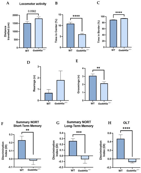 Gadd45a−/− mice behavioral and cognitive results and analysis. The results of the open field test: (A) distance traveled, (B) time spent in the central zone, (C) time spent in the border zone, (D) number of rearings, and (E) number of groomings. (F) Short-term memory test at 2 h and (G) long-term memory test at 24 h. (H) DI obtained in OLT. The results are expressed as a mean ± SEM. One-tailed Student’s t-test compared groups; (n = 15 per group in WT and n = 15 per group in Gadd45a−/−); ** p < 0.01; *** p < 0.001; **** p < 0.0001.