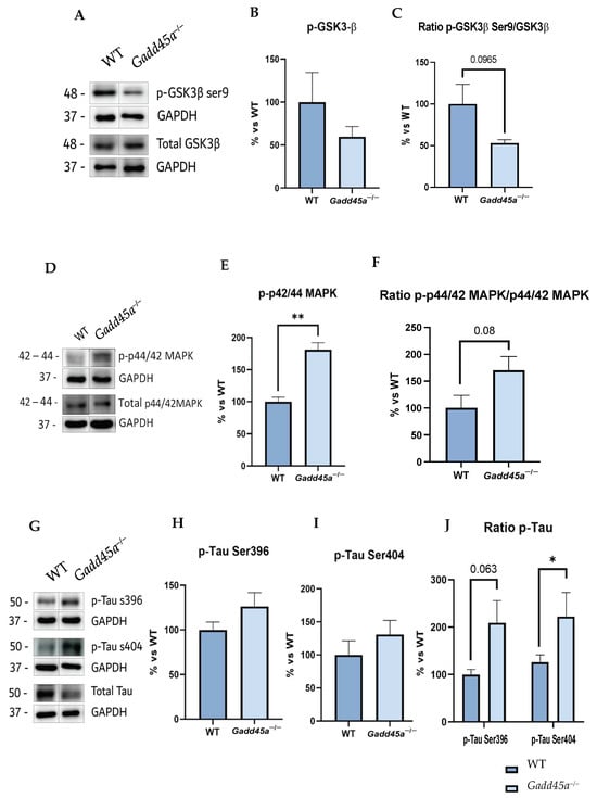 Tau pathology evaluation in Gadd45a−/− mice. (A) Representative WB, and quantification (B) of p-GSK3β Ser9 and (C) ratio of p-GSK3β Ser9 and total GSK3β. (D) Representative WB, and quantification (E) of p-p44/42MAPK and (F) ratio p-p44/42MAPK and total p44/42MAPK. (G) Representative WB, and quantification (H) of p-Tau Ser396, (I) p-Tau Ser404, and (J) ratio p-Tau Ser396, p-Tau Ser404, and total Tau. Bar graph values are 100% adjusted for WT control protein levels. The results are expressed as a mean ± SEM. One-tailed Student’s t-test compared groups; (n = 4 per group (outliers: n = 1 in WT in p-GSK3β ratio levels)); * p < 0.05, ** p < 0.01.