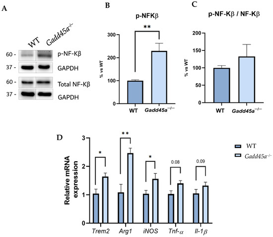 Neuroinflammation markers in Gadd45a−/− mice. (A) Representative WB and quantification (B) of p-NF-KB and (C) ratio p-NF-KB and total NF-KB. (D) Gene expression of inflammatory markers: Trem2, Arg1, iNOS, Tnf-α, and Il-1β. Gene expression was determined by real-time qPCR. Bar graph values are 100% adjusted for WT control protein level and WT control gene expression, respectively. The results are expressed as a mean ± SEM. One-tailed Student’s t-test compared groups; (n = 4 per group in (A–C) and n = 6 per group in (D) (outliers: n = 1 in WT and n = 1 in Gadd45a−/− in Trem2; n = 1 in WT in iNOS and n = 2 in WT in Arg1; n = 2 in WT and n = 2 in Gadd45a−/− in Tnf-α; and n = 2 in WT and n = 1 in Il-1β)); * p < 0.05; ** p < 0.01.