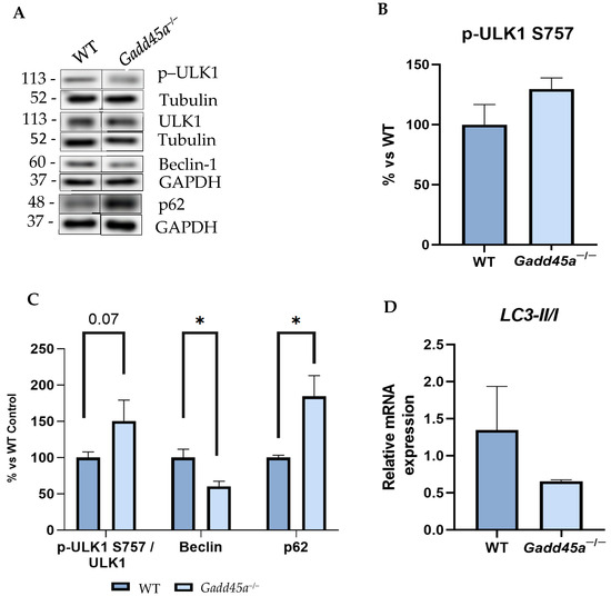 Gadd45a−/− mice autophagy deregulation. (A) Representative WB and quantification (B) of p-ULK1 Ser757 and (C) p-ULK1 Ser757/ULK1, Beclin-1, and p62 protein levels. (D) Gene expression of LC3II/I was determined by real-time qPCR. Bar graph values are 100% adjusted for WT control protein levels. The results are expressed as a mean ± SEM. One-tailed Student’s t-test compared groups (n = 4 per group in (A–C) and n = 6 per group in (D) (outliers: n = 1 in WT in Beclina1; n = 1 in WT and n = 1 in Gadd45a−/- in p62; and n = 1 in Gadd45a−/− in LC3-II/I)); * p < 0.05.