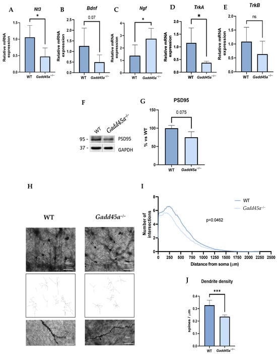 Neural plasticity in Gadd45a−/− mice: gene expression evaluation of neurotrophins and their receptors: (A) Nt3, (B) Bdnf, (C) Ngf, (D) TrkA, and (E) TrkB. (F) Representative WB, and quantification (G) of PSD95 protein levels. (H) Cortex representative images of WT and Gadd45a−/− Golgi staining (scale bar = 100 µm and 5 µm). (I) The number of intersections vs. distance from the soma. (J) Quantification of the dendrite density in both groups. Bar graph values are 100% adjusted for WT control gene expression. The results are expressed as a mean ± SEM. Groups were compared by one-tailed Student’s t-test; (n = 6 per group in (A–E) (outliers: n = 1 in Gadd45a−/− in Nt3 expression; n = 1 in WT in TrkA expression; and n = 2 in WT in Ngf expression); n = 4 per group in (F,G) and n = 100 per group in (H–J)); * p < 0.05; *** p < 0.001.