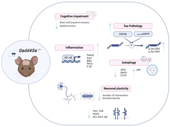 In this study, we aimed to evaluate the role of Gadd45a on behavior and cognition by using the Gadd45a−/− mouse. In addition, we studied the molecular changes regarding AD hallmarks, neuroinflammation, synaptic plasticity, and autophagy processes. Interestingly, we found that lacking the Gadd45a gene is critical to cognition and the neurodegenerative process by increasing neuroinflammation and altering the autophagy process and synaptic plasticity.
