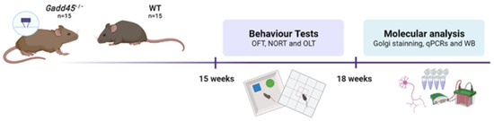 Wild-type (WT, n = 16) and knockout (Gadd45a−/− KO, n = 16) 4-month-old mice were used to perform the behavioral and molecular analyses. Animals had free access to water and food and remained under standard temperature conditions (22 ± 2 °C) and 12 h/12 h light/dark cycles (300 lux/0 lux).