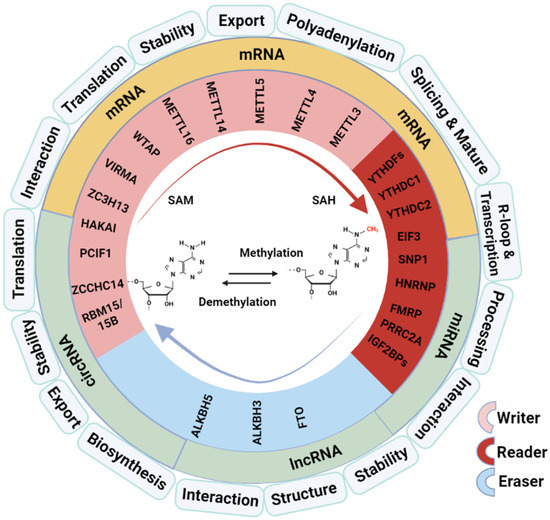 Overview of M6A modifiers and regulation on RNA processing and functions. SAM: methyl donor S-adenosylmethionine; SAH: S-adenosyl-L-homocysteine. The graphical was created with Biorender (https://app.biorender.com) on 10 January 2024 and a license was granted (SF26BNDZ9M).