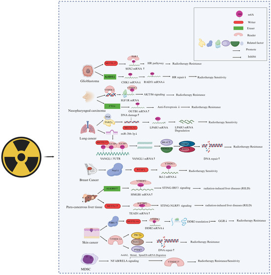 Involvement of M6A “writers”, “erasers”, and “readers” in the responses of cancer cells to radiotherapy. The graphical was created and revised with Biorender (https://www.biorender.com/, accessed on 20 February 2024), and a license was granted (UL26HEBPMU).