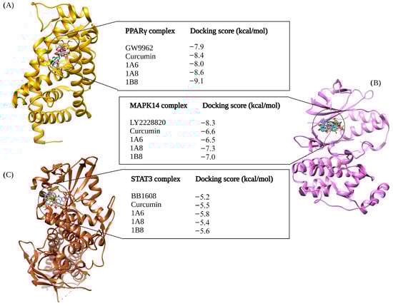 In silico binding affinity scores and superimposed docked complexes of curcumin and its synthetic curcumin derivatives (1A6, 1A8, and 1B8) bound to human target proteins involved in adipogenesis, including PPARγ (PDB ID: 7WGO), MAPK14 (PDB ID: 5XYX), and STAT3 (PDB ID: 6NUQ). All three target proteins were also docked with experimentally identified inhibiting standards; (A) GW9662 was docked to PPARγ with a binding energy of −7.9 kcal/mol, (B) LY2228820 was docked to MAPK14 with binding energy of −8.3 kcal/mol, and (C) BB1608 was docked to STAT3 with a binding energy of −5.2 kcal/mol. Abbreviations: MAPK14—mitogen-activated protein kinase 14; PPARγ—peroxisome proliferator-activated receptor gamma; STAT3—signal transducer and activator of transcription 3. Created with BioRender.com (accessed on 19 November 2023).