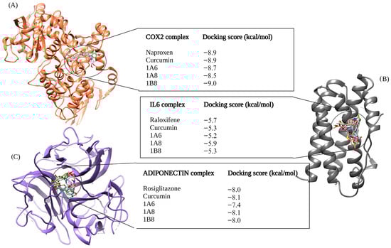 In silico binding affinity scores and superimposed docked complexes of curcumin and synthetic curcumin derivatives (1A6, 1A8, and 1B8) bound to human target proteins of inflammation such as COX2 (PDB ID: 5F1A), IL6 (PDB ID: 1ALU), and Adiponectin (PDB ID: 6U66). All three target proteins were docked with experimentally established inhibiting standards; (A) Naproxen was docked to COX2 with a binding energy of −8.9 kcal/mol, (B) Raloxifene was docked to IL6 with binding energy of −5.7 kcal/mol, and (C) Rosiglitazone was docked to Adiponectin with a binding energy of −8.0 kcal/mol. Abbreviations; COX2—cyclooxygenase 2, IL6—interleukin 6. Created with BioRender.com (accessed on 19 November 2023).