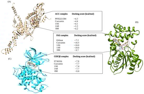 In silico binding affinity scores and superimposed docked complexes of curcumin and synthetic curcumin derivatives (1A6, 1A8, and 1B8) bound to human target proteins involved in lipid metabolism such as ACC (PDB ID: 3TDC), FAS (PDB ID: 3TJM), and GSK3β (PDB ID: 5F95). All three target proteins were docked with experimentally established inhibiting standards; (A) PF0522104 was docked to ACC with a binding energy of −4.3 kcal/mol, (B) Orlistat was docked to FAS with binding energy of −7.5 kcal/mol, and (C) FT30356 was docked to GSK3β with a binding energy of −7.8 kcal/mol. Abbreviations; ACC—acetyl-CoA carboxylase, FAS—fatty acid synthase, GSK3β—glycogen synthase kinase 3beta. Created with BioRender.com (accessed on 19 November 2023).