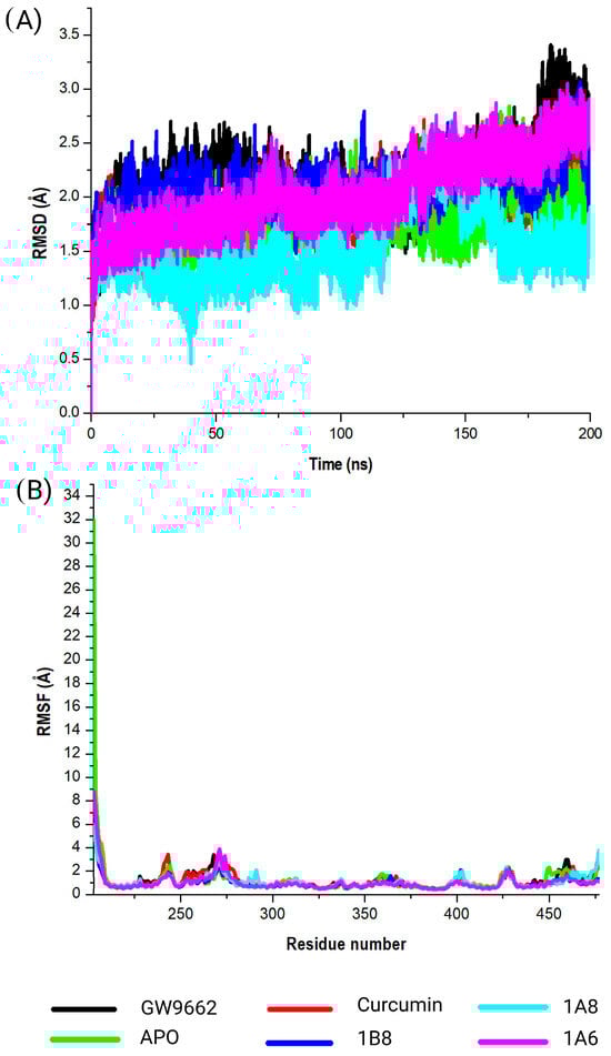 Analysis of the MD simulations of PPARγ in complex with GW9662, curcumin, 1A6, 1A8, and 1B8. (A) demonstrates the RMSD values of the MD simulated systems, while (B) illustrates the RMSF values of the MD simulated systems. The native PPARγ is referred to as APO.