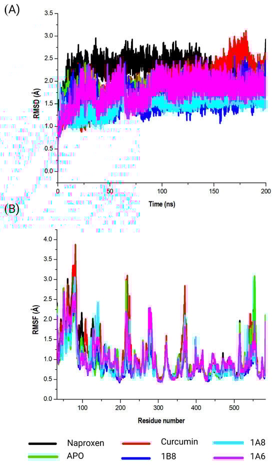 Analysis of the MD simulations of COX2 in complex with Naproxen, curcumin, 1A6, 1A8, and 1B8. (A) demonstrates the RMSD values of the MD simulated systems, while (B) illustrates the RMSF values of the MD simulated systems. The native COX2 is referred to as APO.