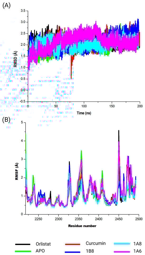 Analysis of the MD simulations of FAS in complex with Orlistat, curcumin, 1A6, 1A8, and 1B8. (A) demonstrates the RMSD values of the MD simulated systems, while (B) illustrates the RMSF values of the MD simulated systems. The native FAS is referred to as APO.