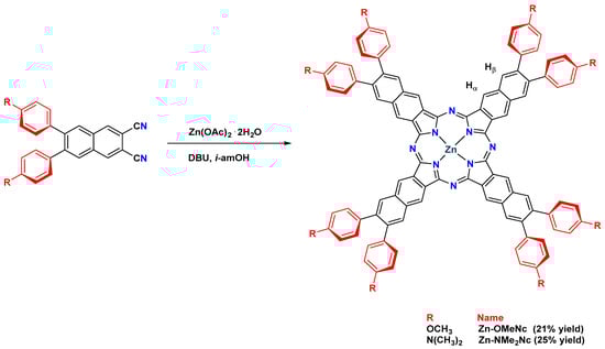 The peripheral functionalization was achieved by means of a Suzuki–Miyaura coupling reaction between 6,7-dibromo-2,3-dicyanonaphthalene (1) and the corresponding boronic acids, following our previously reported methodology []. This substitution pattern was chosen in accordance with our recent report showing that the push–pull character and perpendicular-to-plane rigidified arrangement of the two phenyl moieties can provide strong luminescence in aggregates as well as in solution. The detailed synthetic procedure is shown in Section 3 (vide infra). The substituted naphthalonitriles NMe2 and OMe were converted into the corresponding naphthalocyaninato zinc(II) complexes Zn-OMeNc and Zn-NMe2Nc by refluxing them in isoamyl alcohol (i-amOH) in the presence of 1,8-diazabicycloundec-7-ene (DBU) in catalytic amounts (Figure 1).