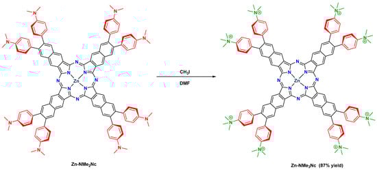 3.1.7. Synthesis of 3,4,12,13,21,22,30,31-Octakis(4-(N,N,N-trimethylammonium)phenyl) naphthalocyaninato Zinc(II) Octaiodide (Zn-NMe3Nc)