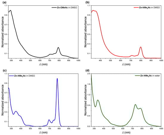 UV-vis absorption spectra normalized at the corresponding λmax for Zn-OMeNc (a), Zn-NMe2Nc (b), and Zn-NMe3Nc (c) in DMSO, as well as for Zn-NMe3Nc in water (d).
