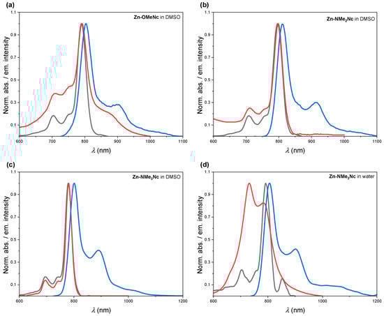 Absorption (red), excitation (black, λem = 920 nm), and emission (blue, λex = 750 nm) spectra of Zn-OMeNc (a), Zn-NMe2Nc (b), Zn-NMe3Nc in DMSO (c) and Zn-NMe3Nc in water (d).