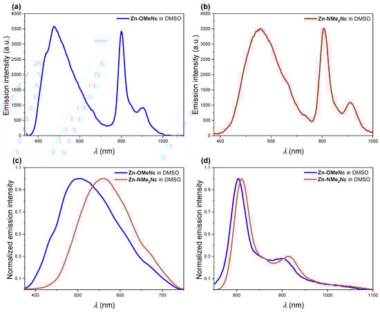 Fluorescence in DMSO: (a) full-range emission spectrum of Zn-OMeNc (blue), λex = 335 nm; (b) full-range spectrum of Zn-NMe2Nc (red), λex = 335 nm; (c) normalized emission spectra of Zn-OMeNc (blue) and Zn-NMe2Nc (red) in the visible region, λex = 335 nm; (d) normalized emission spectra of Zn-OMeNc (blue) and Zn-NMe2Nc (red) in the near-infrared region, λex = 750 nm. In the full-range emission spectra (a,b), the bands may appear slightly different (if compared with (c,d), both in shape and intensity), due to the different instrumental settings and filters employed (for details, see Section 3.3).