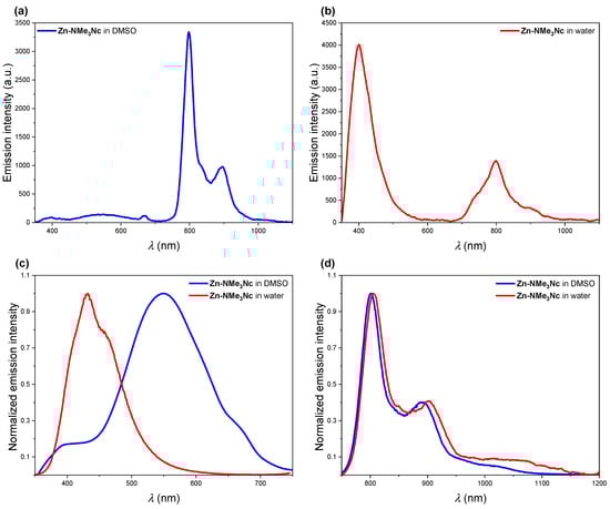 Fluorescence in DMSO and in water: (a) full-range emission spectrum of Zn-NMe3Nc (blue) in DMSO, λex = 335 nm; (b) full-range emission spectrum of Zn-NMe3Nc (red) in water, λex = 335 nm; (c) normalized emission spectra of Zn-NMe3Nc in DMSO (blue) and water (red) in the visible region, λex = 335 nm; (d) normalized emission spectra of Zn-NMe3Nc in DMSO (blue) and water (red) in the near-infrared region, λex = 750 nm. In the full-range emission spectra (a,b), the bands may appear slightly different (if compared with (c,d), both in shape and intensity) due to the different instrumental settings and filters employed (for details see Section 3.3).