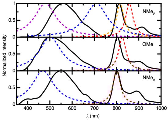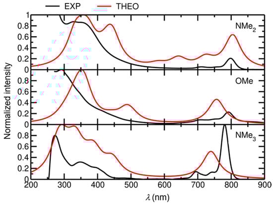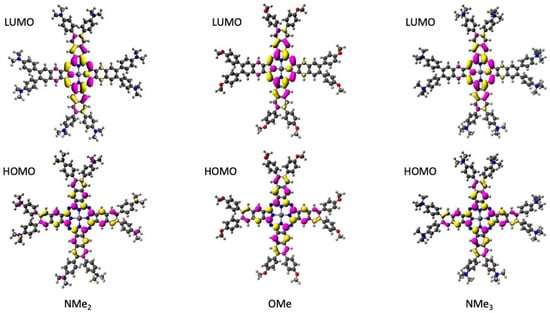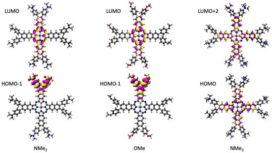 As can be seen from Figure 8, the theoretical spectra generally agree well with the experimental data. Due to the degeneracy of the LUMO and LUMO + 1 orbitals, the S1 and S2 states are also doubly degenerate, as they can be described by HOMO → LUMO and HOMO → LUMO+1 excitations, respectively. The band corresponding to the S0 → S1/2 transition—located at 805 nm, 756 nm, and 740 nm for Zn-NMe2Nc, Zn-OMeNc, and Zn-NMe3Nc, respectively—shows a progressive blue shift with decreasing electron donor ability, in good agreement with the experimental data (and also qualitatively with respect to the relative intensities of the B- and Q-bands). The high intensity of this NIR maximum can be explained by the fact that it represents a local excitation within the 2,3-naphthalocyaninato ligand (the black part of the structure depicted in Figure 1, see Figure 9 for a visualization of the relevant frontier orbitals).