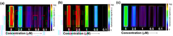 MSOT photoacoustic images of gel phantoms at different concentrations: (a) Zn-Nme2Nc in DMSO, (b) Zn-Nme3Nc in DMSO, and (c) Zn-NMe3Nc in water (λex = 745 nm).