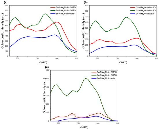 Photoacoustic spectra of Zn-NMe2Nc in DMSO (red) and Zn-NMe3Nc in DMSO (green) and water (blue) at different concentrations, obtained from reconstructed MSOT photoacoustic images. Spectra at concentration of 5 μM (a), 2.5 μM (b), and 1 μM (c).