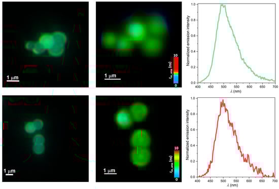 Further experiments were carried out to assess the photophysical properties of discrete Zn-NMe2Nc@PSMP. Briefly, Zn-NMe2Nc@PSMP were placed on a microscope slide and analyzed using single-photon excitation (SPE) to carry out fluorescence lifetime imaging microscopy (FLIM). As depicted in Figure 15, the particles were homogeneously stained with the push–pull luminophore, confirming the observation that is shown in Figure 14, while possessing a homogeneously distributed amplitude-weighted average lifetime of τ ≈ 3.9 ns (Figure 15 and Figure S57). In addition, employing a spectrophotometer coupled by an optical fiber to the confocal microscope, the emission spectra of discrete Zn-NMe2Nc@PSMP entities were obtained as dry samples while consistently reproducing the results for Zn-NMe2Nc@PSMP that was suspended in liquid water (Figure 15). In contrast to single-photon excitation (SPE), two-photon excitation (TPE) laser scanning microscopy is often anticipated to increase cell survival and tissue penetration []. Thus, we explored herein a way to increase the detection sensitivity due to an improved sample penetration employing a near-infrared TPE laser; we therefore performed comparable FLIM experiments using a high-intensity Ti:Sa oscillator as the two-photon excitation source (Figure 15), where comparable photoluminescence lifetime maps were obtained. In addition, the emission spectra of discrete Zn-NMe2Nc@PSMP were also measured by TPE. These experiments demonstrate that no significant differences are to be expected when using SPE and TPE (both in lifetimes (Figures S57 and S58) and in the emission spectra) for optical imaging, while providing a second readout for microscopic imaging.