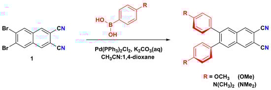 6,7-dibromonaphthalene-2,3-dicarbonitrile (1) was synthesized according to a published procedure [,,]. The 6,7-disubstituted naphthalene-2,3-dicarbonitriles were obtained by Suzuki–Miyaura reactions from 1 with the corresponding boronic acids (Scheme 1) []. Briefly, a mixture of 1 (1 equiv.), the corresponding p-substituted-phenylboronic acid (4 equiv.), and a saturated aqueous solution of K2CO3 (5 mL) were stirred in 50 mL of a boiling mixture of 1,4-dioxane:acetonitrile (8:3 v/v) under argon. Afterwards, palladium(II)bis(triphenylphosphane) dichloride (0.01 equiv.) was added to the boiling mixture. The reaction was stirred for 6 h (TLC control: Al2O3, F254, ethyl acetate:hexane, 1:4). After consumption of the starting materials, the reaction mixture was cooled down to room temperature and water was added. The product was collected by extraction with dichloromethane, and the organic layer was dried with anhydrous MgSO4. The residue was treated by flash chromatography on silica (ethyl acetate:hexane, 1:2) to remove impurities. The resulting compound was additionally purified by column chromatography on silica using DCM as the eluent to obtain the corresponding p-phenyl-6,7-disubstituted naphthalene-2,3-dicarbonitrile.