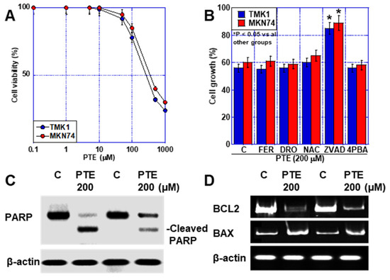 Effect of PTE-H in GC cells. (A) Effect of PTE on cell growth in GC cell lines, TMK1, and MKN74. (B) Cell death inhibitor assay. Cells were treated with PTE-H (200 μM) for 48 h with or without cell inhibitors. * p < 0.05 vs. all other groups. (C) PARP cleavage by PTE-H. (D) Effect of PTE-H on expression of BCL2 and BAX. Error bar, standard deviation from three independent trials. * Significance was calculated using Tukey methods. GC, gastric cancer; PTE, pterostilbene; PTE-H, high-dose PTE; BCL2, B-cell lymphoma 2 gene; BAX, BCL-2-associated X protein gene; C, control; FER, ferrostatine-1; DFO, deferoxamine; NAC, N-acetyl-L-cysteine; ZVAD, Z-VAD-FMK; 4PBA, 4-phenylbutyric acid; PARP, poly ADP-ribose polymerase.