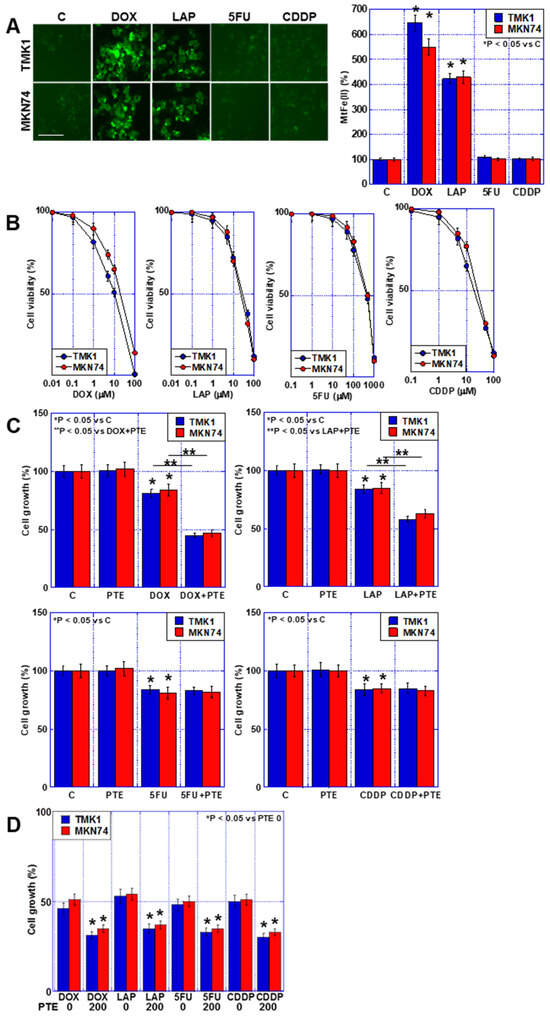 Accumulation of mtFe and PTE-L in GC cells. (A) Accumulation of mtFe in GC cells treated with PTE-L (10 μM) for 48 h. Scale bar, 50 µm. (Right) Semi-quantification of mtFe. * p < 0.05 vs. C. (B) Sensitivity to anti-cancer drugs: DOX, LAP, 5FU, CDDP. (C) Effect of concurrent treatment with anti-cancer drugs (IC20) and PTE-L. * p < 0.05 vs. C, p < 0.05 vs. DOX+PTE, or ** p < 0.05 vs. LAP+PTE. (D) Effect of concurrent treatment with anti-cancer drugs (IC20) and PTE-H (200 μM). * p < 0.05 vs. PTE 0. Error bar, standard deviation from three independent trials. *,** Significance was calculated using ANOVA. GC, gastric cancer; PTE, pterostilbene; PTE-H, high-dose PTE; PTE-L, low-dose PTE; C., control; mtFe, mitochondrial iron (II); DOX, doxorubicin; LAP, lapatinib; 5FU, 5-fluorouracil; CDDP, cisplatin; IC, inhibitory concentration.