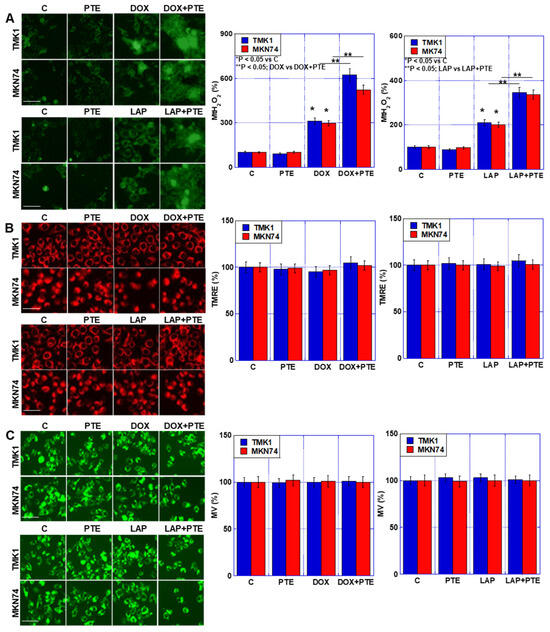To investigate the effects of the combined use of PTE-L, DOX, and LAP on mitochondria, TMK1 and MKN74 GC cells were treated (Figure 3). Increased H2O2 levels were observed in both cell lines (Figure 3A). In contrast, no changes were observed in mitochondrial membrane potential or mitochondrial mass, even when PTE-L and anticancer drugs were combined (Figure 3B,C).